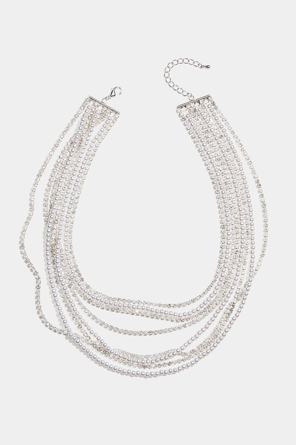 Kaulakoru, jossa on kahdeksan eripituista ketjua, joista viidessä on strasseja ja kolmessa valkoisia helmiä.