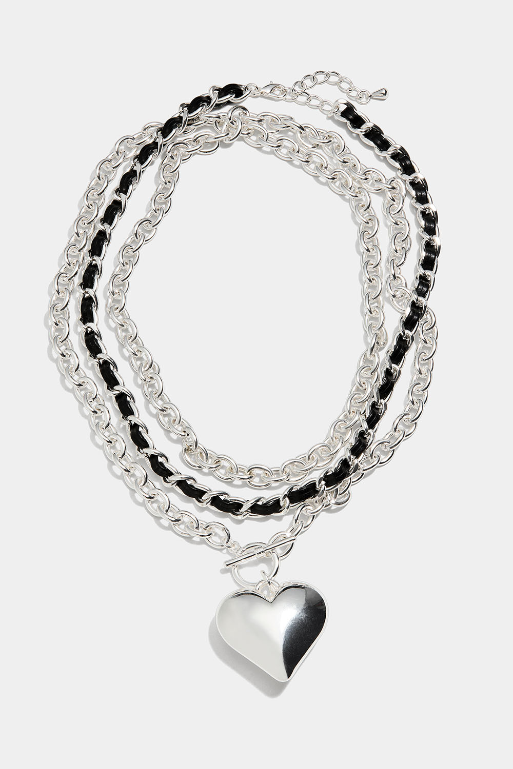 Kaksi hopeanvärisestä metallista valmistettua kaulakorua, joissa on karkea ketju. Lyhyemmässä korussa on punottu tekonahkahihna, ja pidemmässä on suuri sydänriipus ja T-kiinnitys. Pidempää voidaan käyttää täyspitkänä tai kaksinkertaisena, kuten kuvassa.