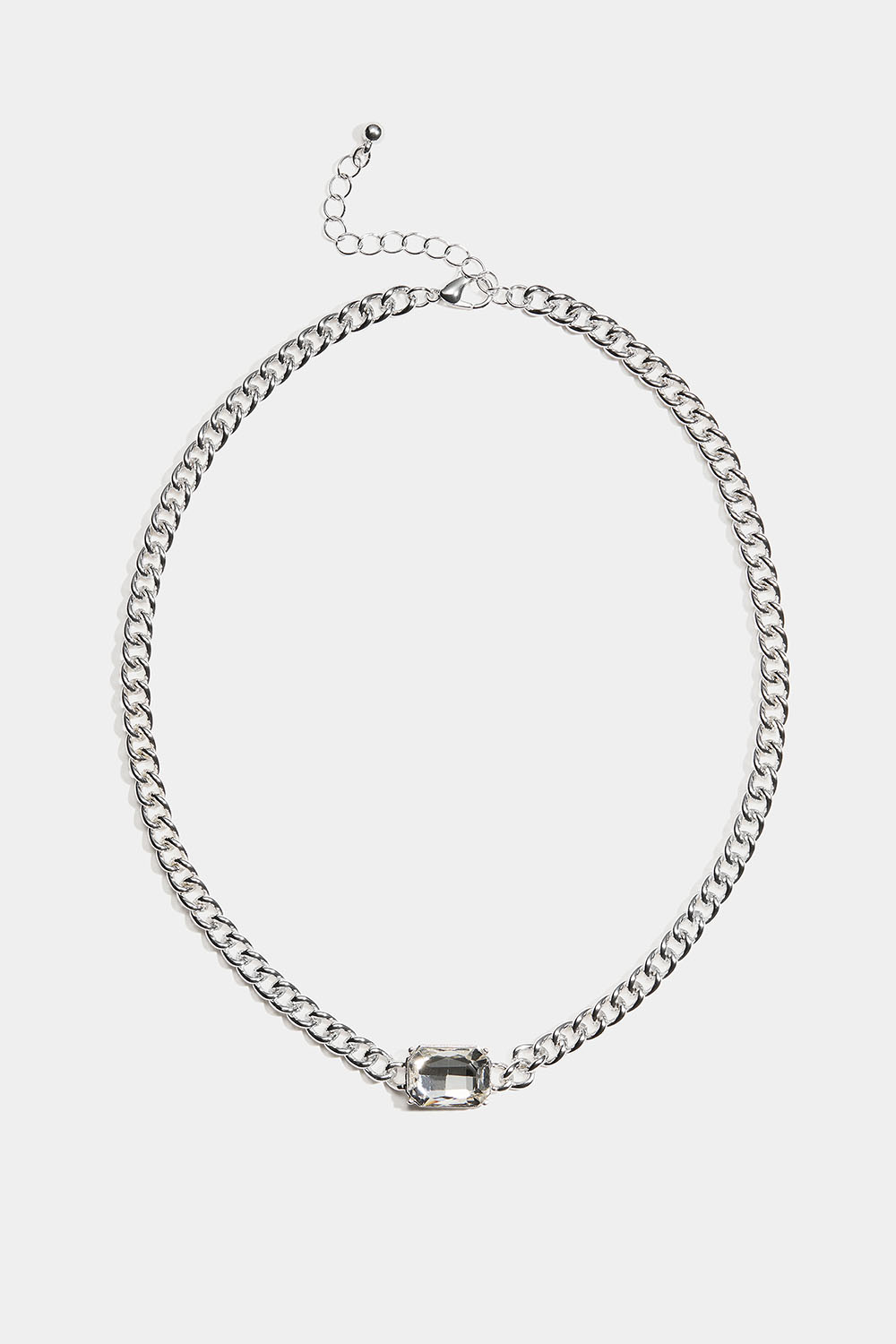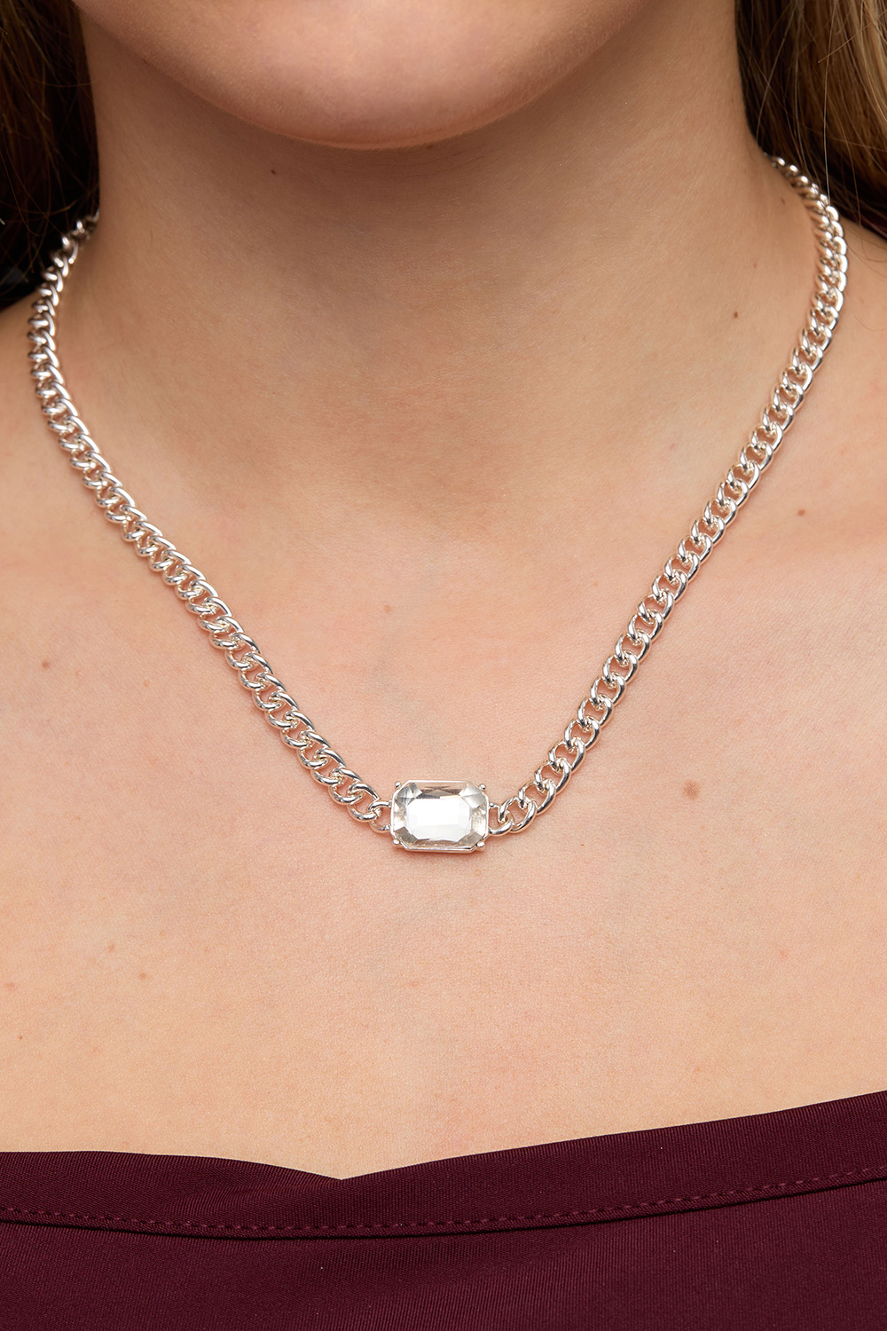 Hopeanvärinen metallinen ketjukaulakoru, jossa on rouhea ketju ja suorakaiteen muotoinen iso lasikivi.