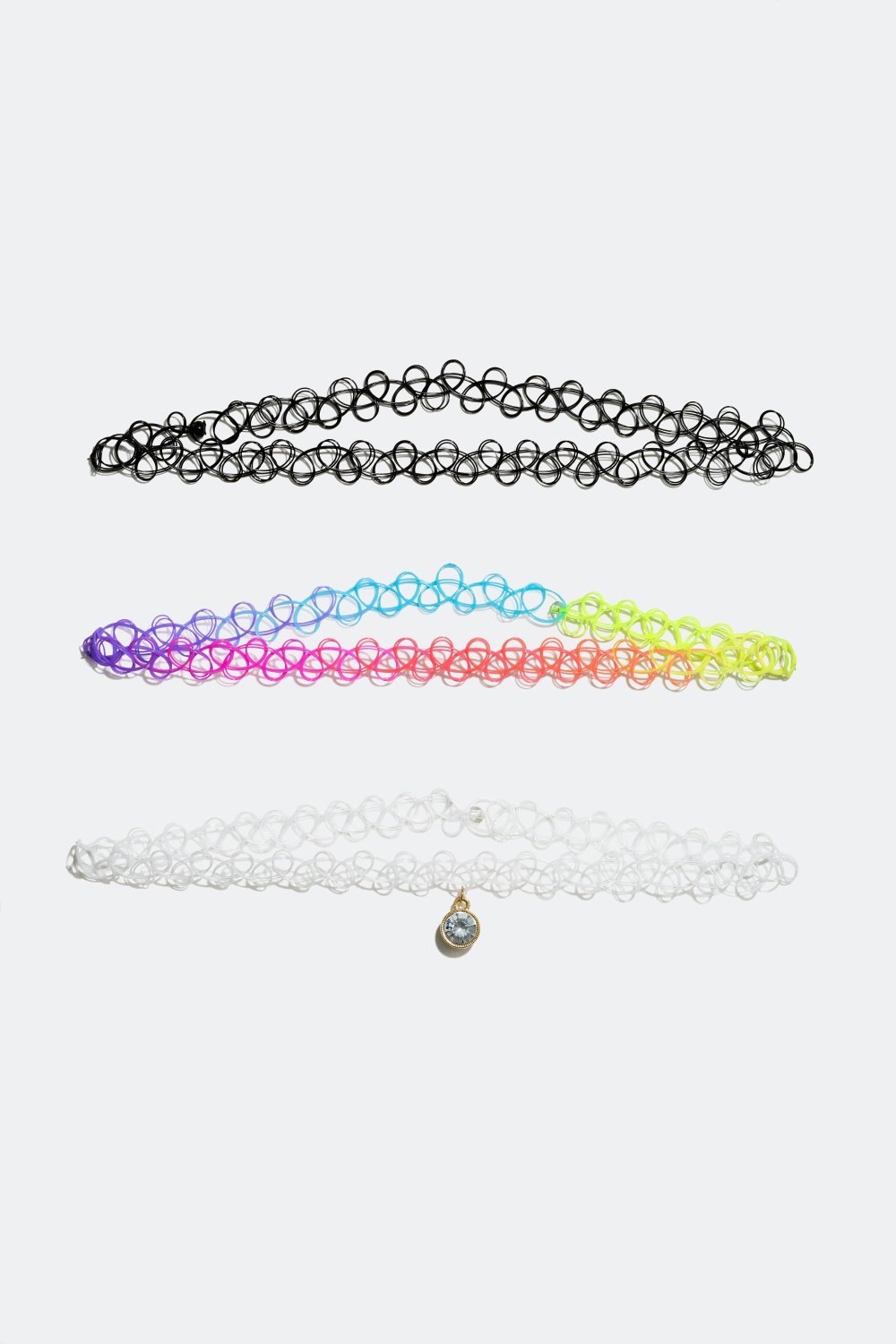 Kolme kaulakorua punottua muovia. Yksi koruista on koristeltu lasikivellä. Nämä kaulakorut ovat venyviä.