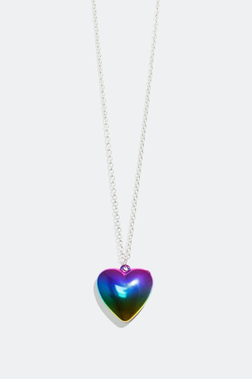 Kaulakoru, suuri sydän - Kaulakoru, jossa ohuessa metalliketjussa suuri sateenkaaren väreissä hohtava sydän. Kaulakorussa on säädettävä pituus.