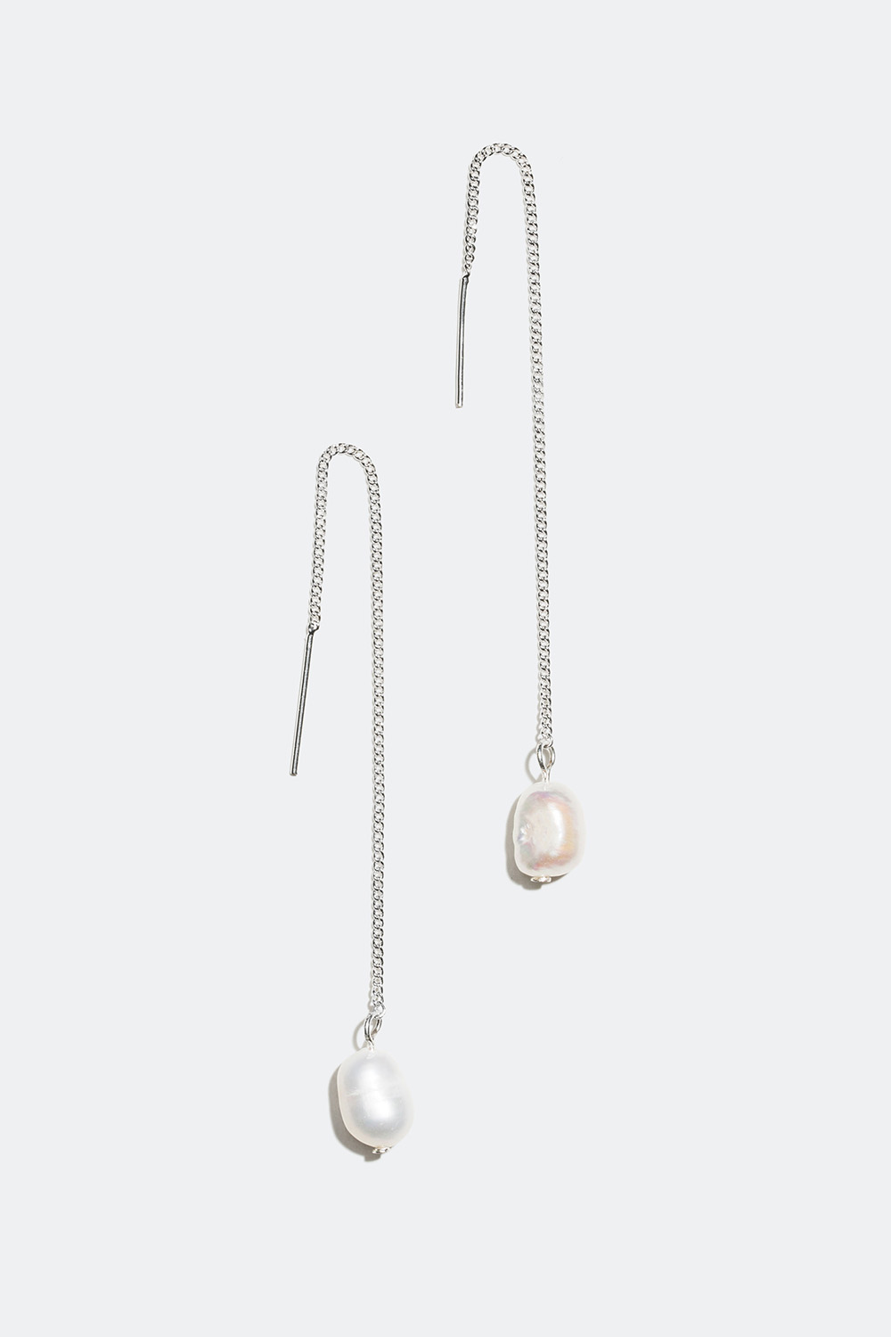 Metalliset ketjukorvakorut, joissa on yksinkertainen ketju ja valkoinen soikea muovihelmi päissä. Korvakoru pujotetaan korvan reiän läpi niin, että ketju roikkuu korvalehden etu- ja takapuolella.