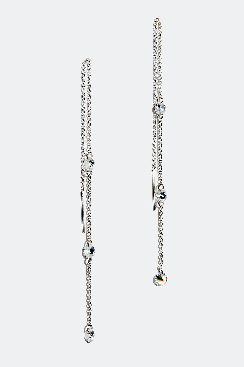 Metalliset ketjukorvakorut, joissa on kolme koristeellista lasikiveä. Tyylikkäät läpivedettävät korvakorut, jotka sopivat mihin tahansa tilanteeseen. Korvakoru pujotetaan korvareiän läpi niin, että se roikkuu korvalehden etu- ja takapuolella, mutta se voidaan myös pujottaa kahden reiän läpi samassa korvassa.