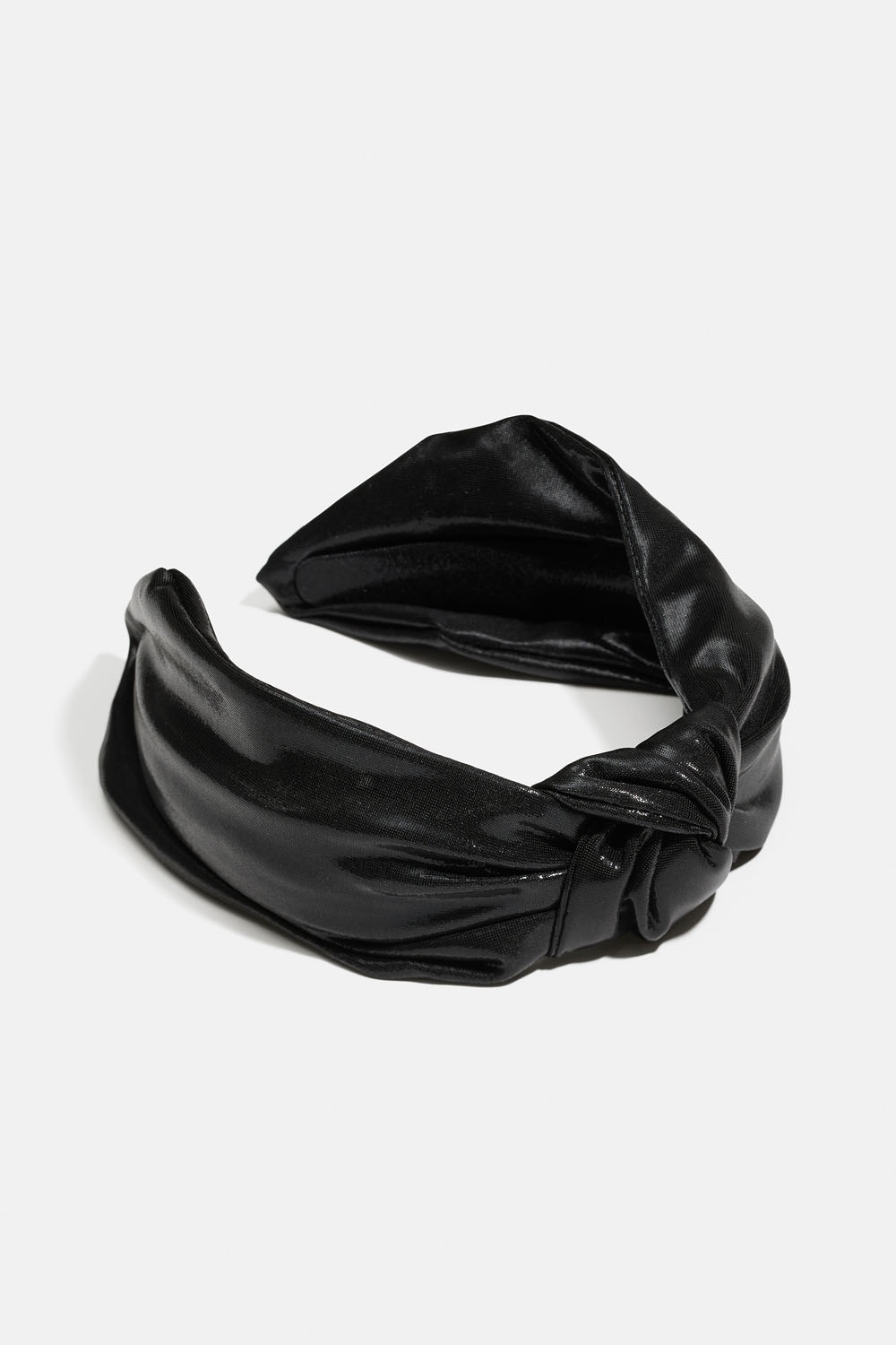 Leveä hiuspanta kiiltävästä mustasta kankaasta koristesolmulla.
