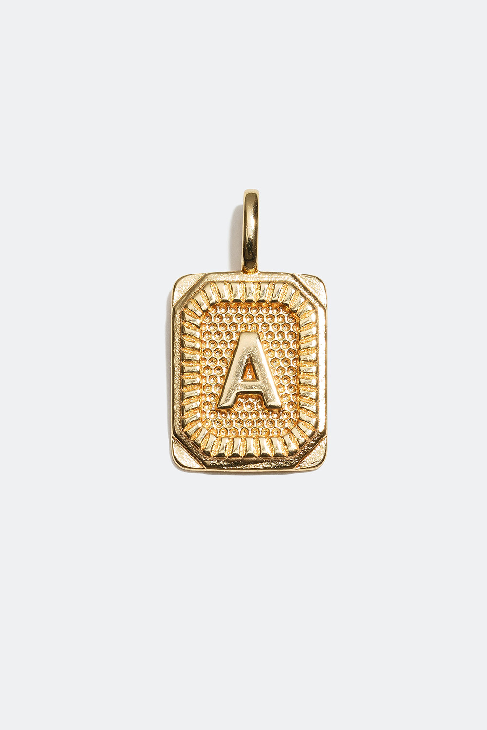 Suorakulmaisen laatan muotoinen kirjainriipus, jossa on kuvioitu pinta. Riipus on aitoa hopeaa, joka on kullattu 18 karaatin kullalla. Valitse monista eri kirjaimista ja yhdistä kaulakoruun. Voit yhdistellä kirjainkorujamme ja tehdä korustasi persoonallisemman luomalla nimen, sanan tai alkukirjaimet. Hieno koru, joka sopii täydellisesti myös lahjaksi.