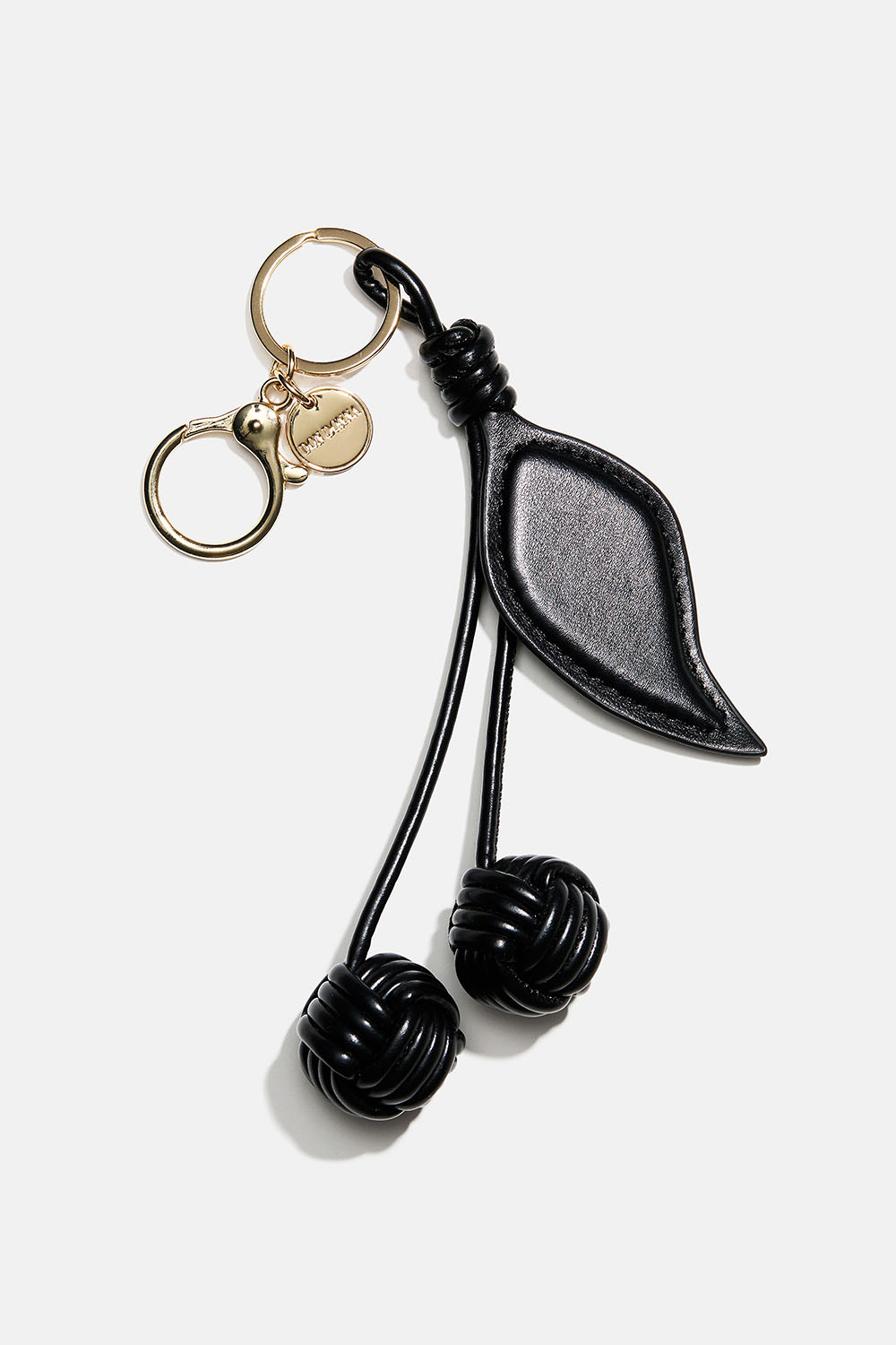 Avaimenperä, jossa on mustasta keinonahasta valmistettu kirsikka. Voidaan kiinnittää renkaalla tai korulukolla.