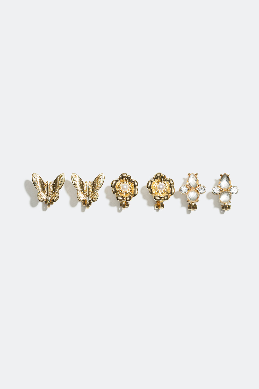 3 paria klipsikorvakoruja: perhoset, muovihelmillä koristellut kukat ja erimuotoiset lasikivet. Täydellinen valinta, jos sinulla ei ole reikiä korvissa, mutta haluat kauniit korvakorut.