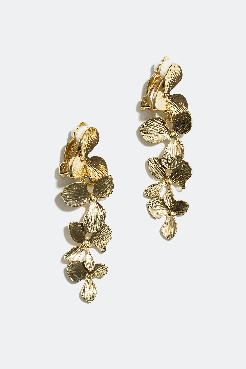 Kullanväriset klipsikorvakorut, joissa roikkuu neljä kukkaa kokojärjestyksessä, suurin kukka kiinnittyy korvaan. Täydellinen koru, jos sinulla ei ole reikiä korvissa, mutta haluat kauniit korvakorut.