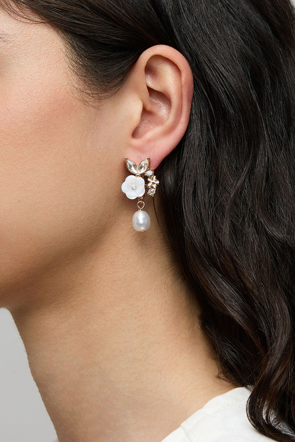 Kullanvärisestä metallista valmistetut klipsikorvakorut, joissa on valkoisia kukkia, lasikiviä ja riipuksia valkoisilla helmillä. Koristeellinen korvakorupari, joka sopii täydellisesti niille, jolla ei ole reikiä korvissa.