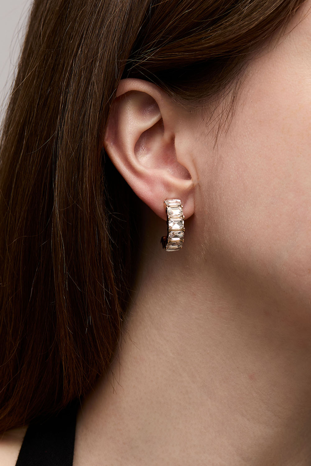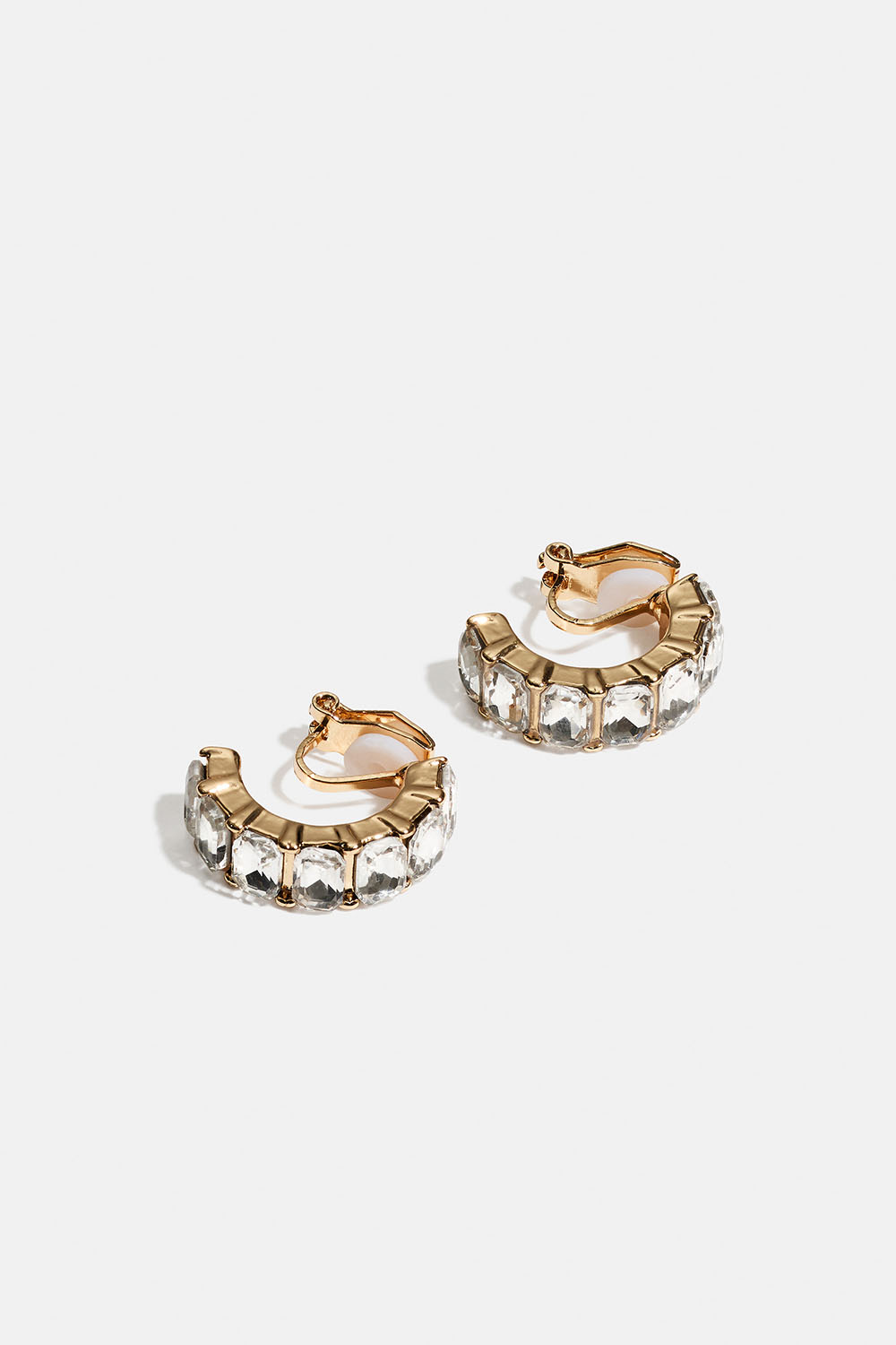 Kullanväriset klipsikorvarenkaat joissa on suorakulmion muotoisia, valkoisia lasikiviä