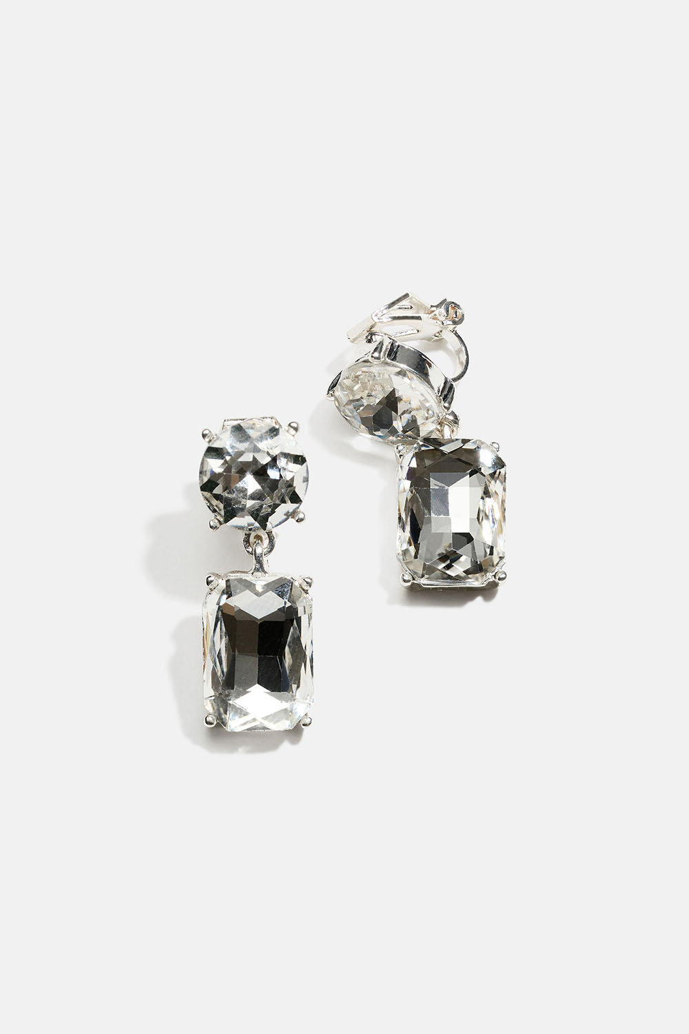 Klipsikorvakorut, joissa on pyöreitä ja suorakulmion muotoisia lasikiviä.