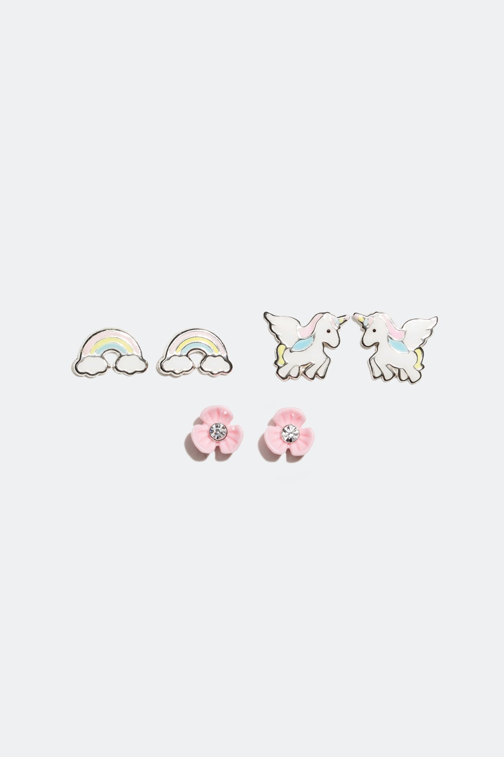 Kolme paria aitoja hopeakorvakoruja: yksisarvinen, sateenkaari ja kukka ryhmässä Lapsille / Lasten korut / Lasten korvakorut @ Glitter (326285)