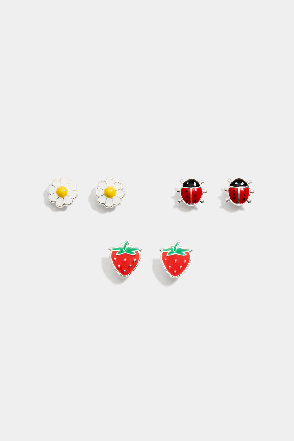Kolme paria hopeakorvakoruja, joissa mansikoita, leppäkerttuja ja päivänkakkaroita ryhmässä Lapsille / Lasten korut / Lasten korvakorut @ Glitter (405000206400)