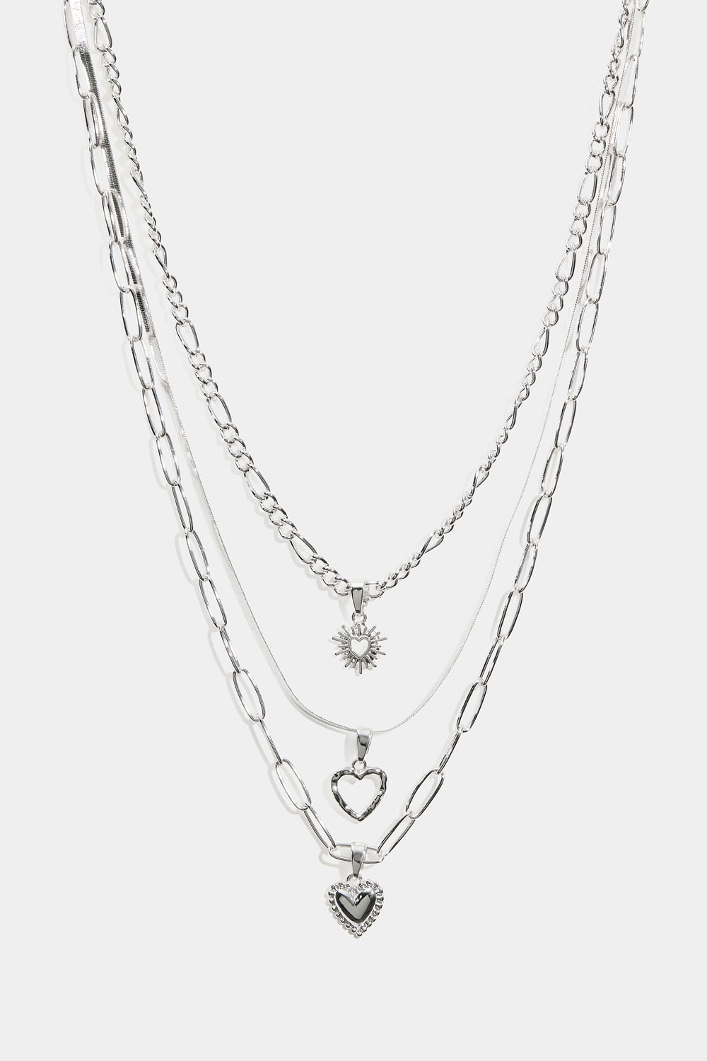Kaulakoru, jossa on kolme erilaista ketjua, joissa on sydämen ja auringon muotoiset riipukset.