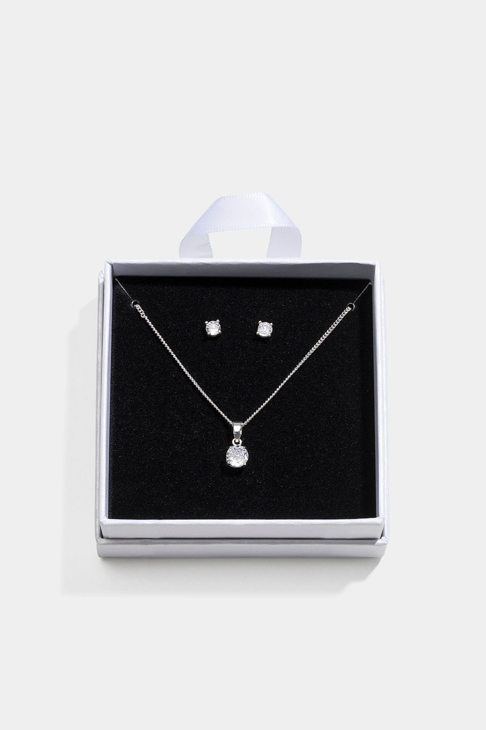 Korusarja koostuu parista hopeanvärisiä nappikorvakoruja, joissa on valkoisia lasikiviä, ja hopeanvärisestä kaulakorusta, jossa on valkoinen lasikivi, kauniisti pakattuna valkoiseen lahjalaatikkoon, jossa on musta samettityyny.