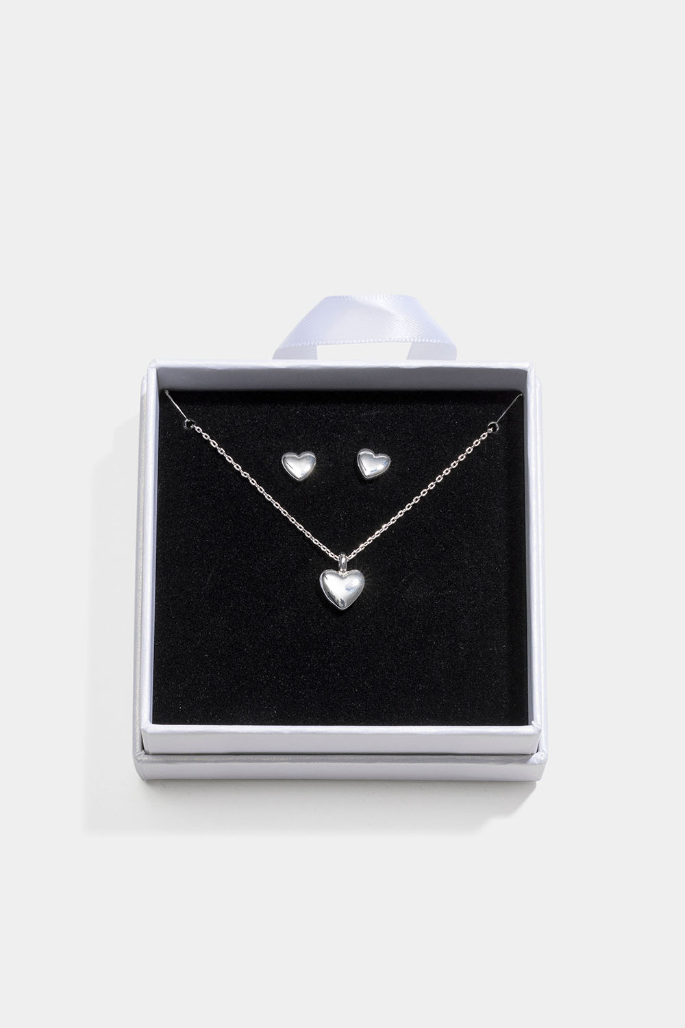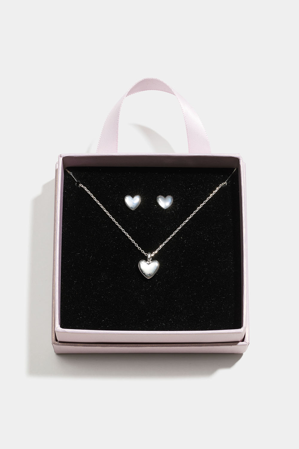 Korusarja koostuu parista hopeanvärisistä sydämillä koristelluista nappikorvakoruista ja hopeanvärisestä kaulakorusta, jossa on sydänriipus, kauniisti pakattuna valkoiseen lahjapakkaukseen, jossa on musta samettityyny.