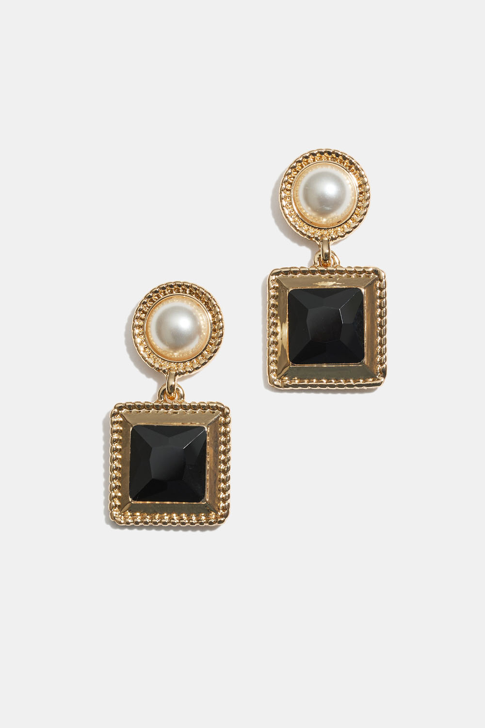 Kullanväriset korvakorut, joissa on pyöreä valkoinen helmi ja neliönmuotoinen musta akryylihelmi.
