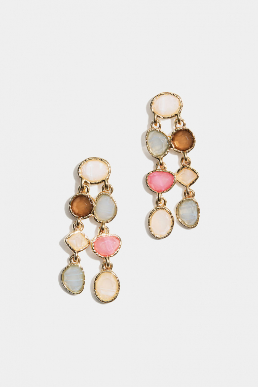 Korvakorut, joiden kaksi riipusta on valmistettu orgaanisen muotoisista, eri värisistä muovikivistä.