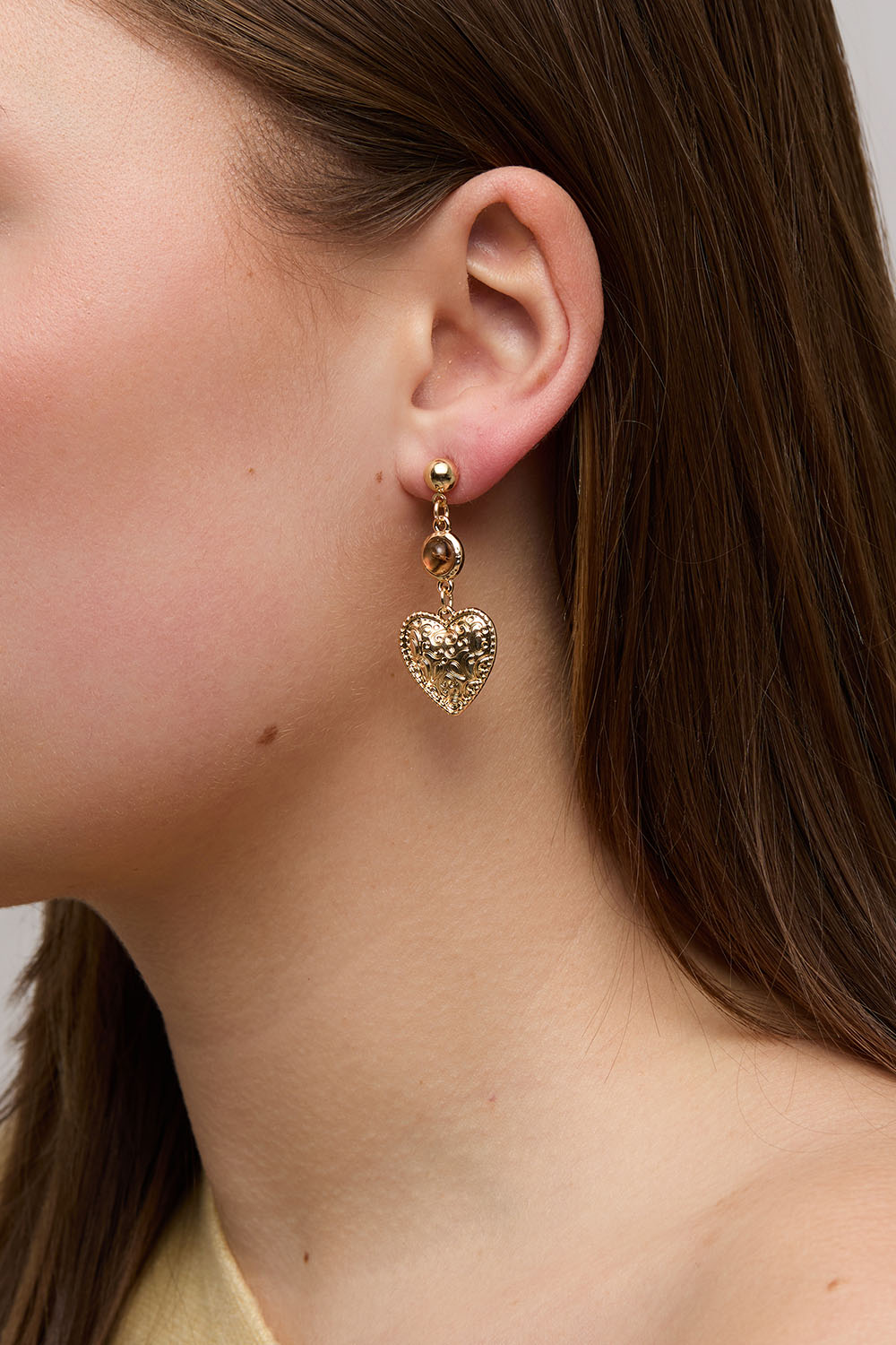 Korvakorut, joissa on ruskeita helmiriipuksia ja kuvioituja antiikkityylisiä sydämiä.