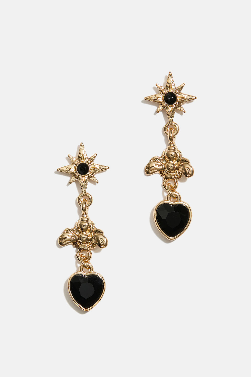 Kullanvärisestä metallista valmistetut korvakorut tähdillä, mehiläisillä ja sydämillä sekä mustilla lasikivillä.