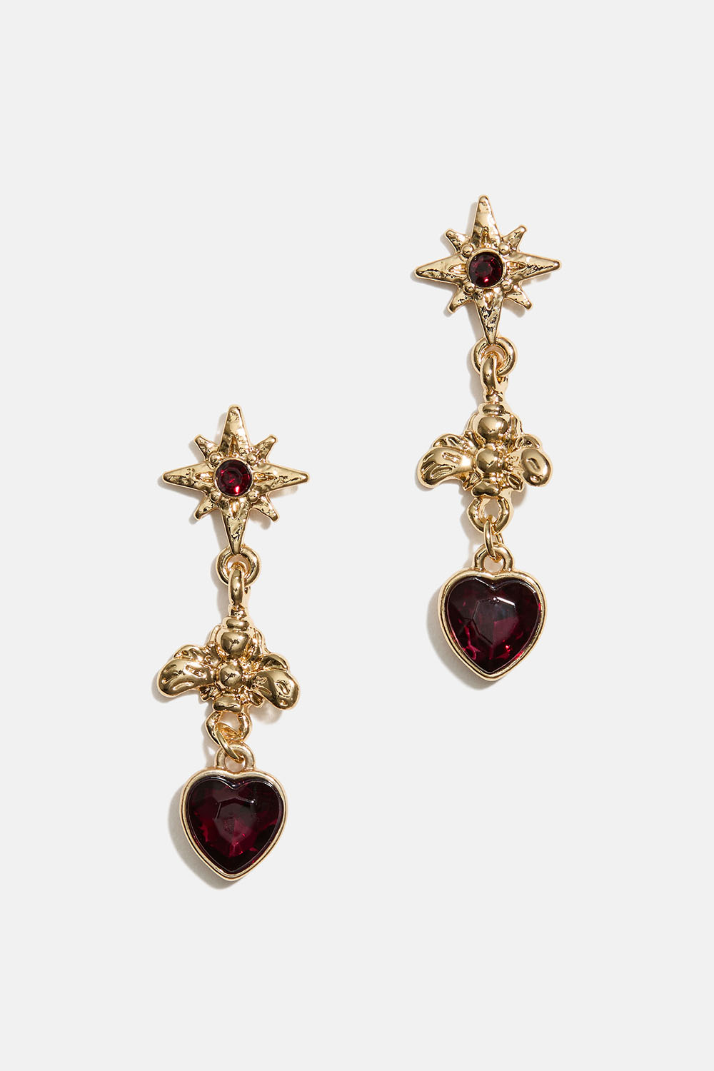 Kullanvärisestä metallista valmistetut korvakorut tähdillä, mehiläisillä ja sydämillä sekä punaisilla lasikivillä.