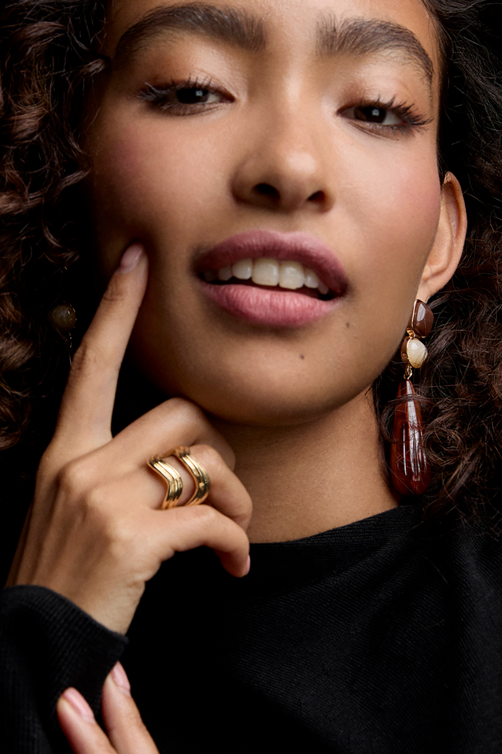 Kullanväriset metallikorvakorut, joissa on eri muotoisia ruskeita ja beigejä lasikiviä.