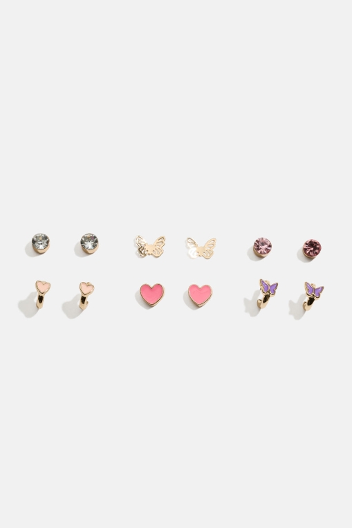 Kullanväriset metallikorvakorut, joissa on vaaleanpunaisia ja violetteja nappikorvakoruja ja renkaita eri malleilla. Kuuden kappaleen pakkaus.