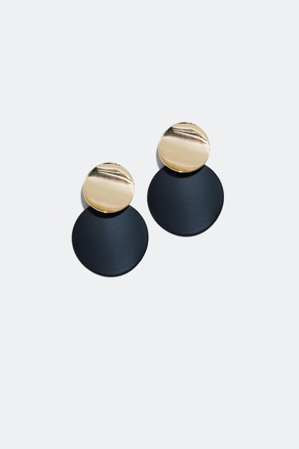 Kauniit ja tyylipuhtaat korvakorut, joista roikkuu kaksi pyöreää laattaa. Alempi laatta on mattamusta ja päällimmäinen kullanvärinen.