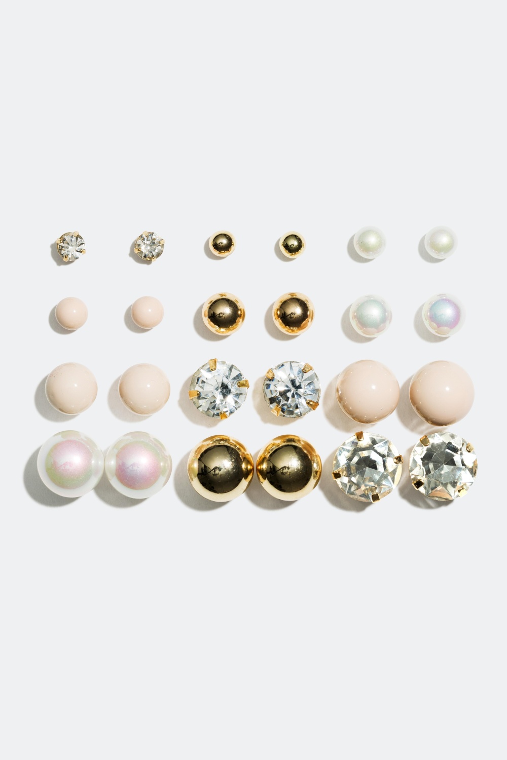 Korvakorut kuulilla ja lasikivillä, monipakkaus - Kaksitoista erilaista ja erikokoista nappikorvakorua kuulilla, muovihelmillä ja lasikivillä.