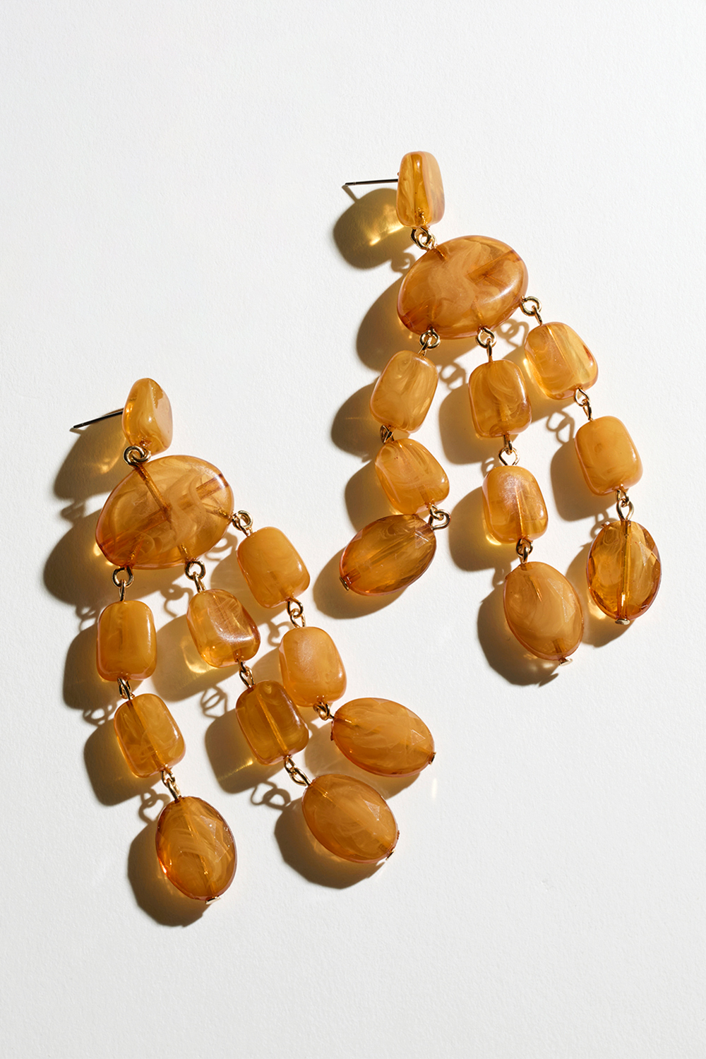 Korvakorut, joissa roikkuvat helmet marmoroidusta ruskea-oranssista hartsista.