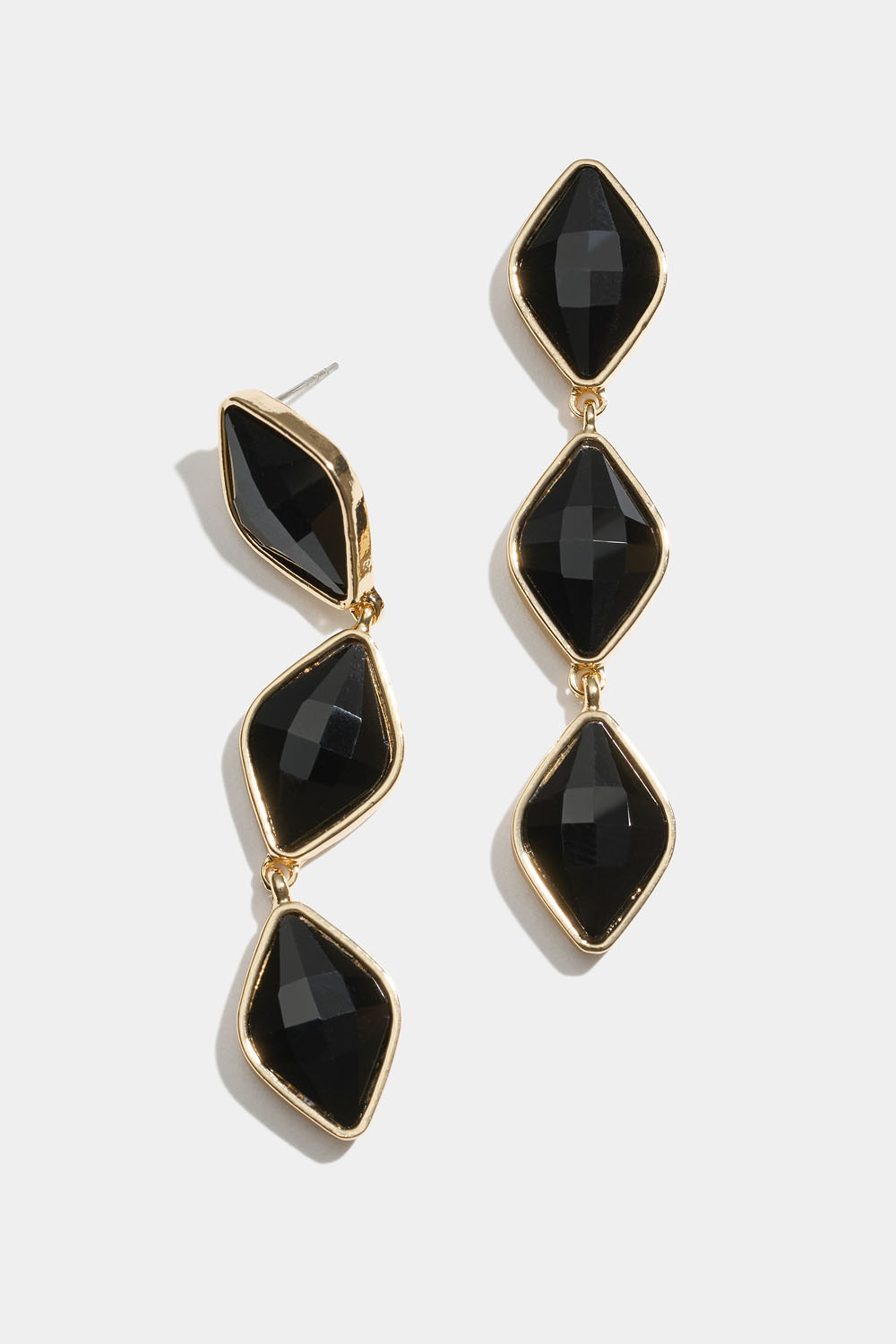 Kullanväriset metallikorvakorut, joissa on kolme kappaletta roikkuvia mustia, timantinmuotoisia lasikiviä.