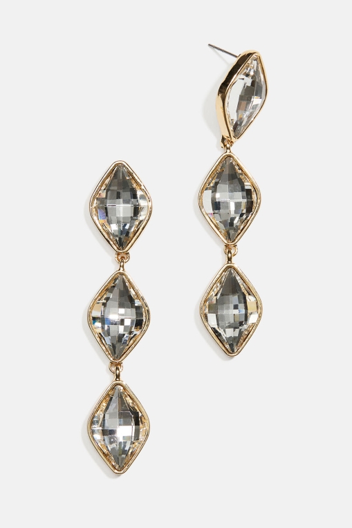 Kullanväriset metallikorvakorut, joissa on kolme kappaletta roikkuvia valkoisia, timantinmuotoisia lasikiviä.