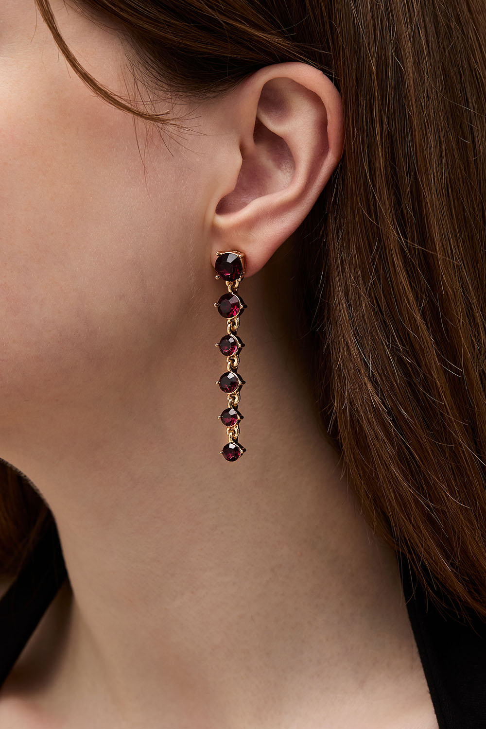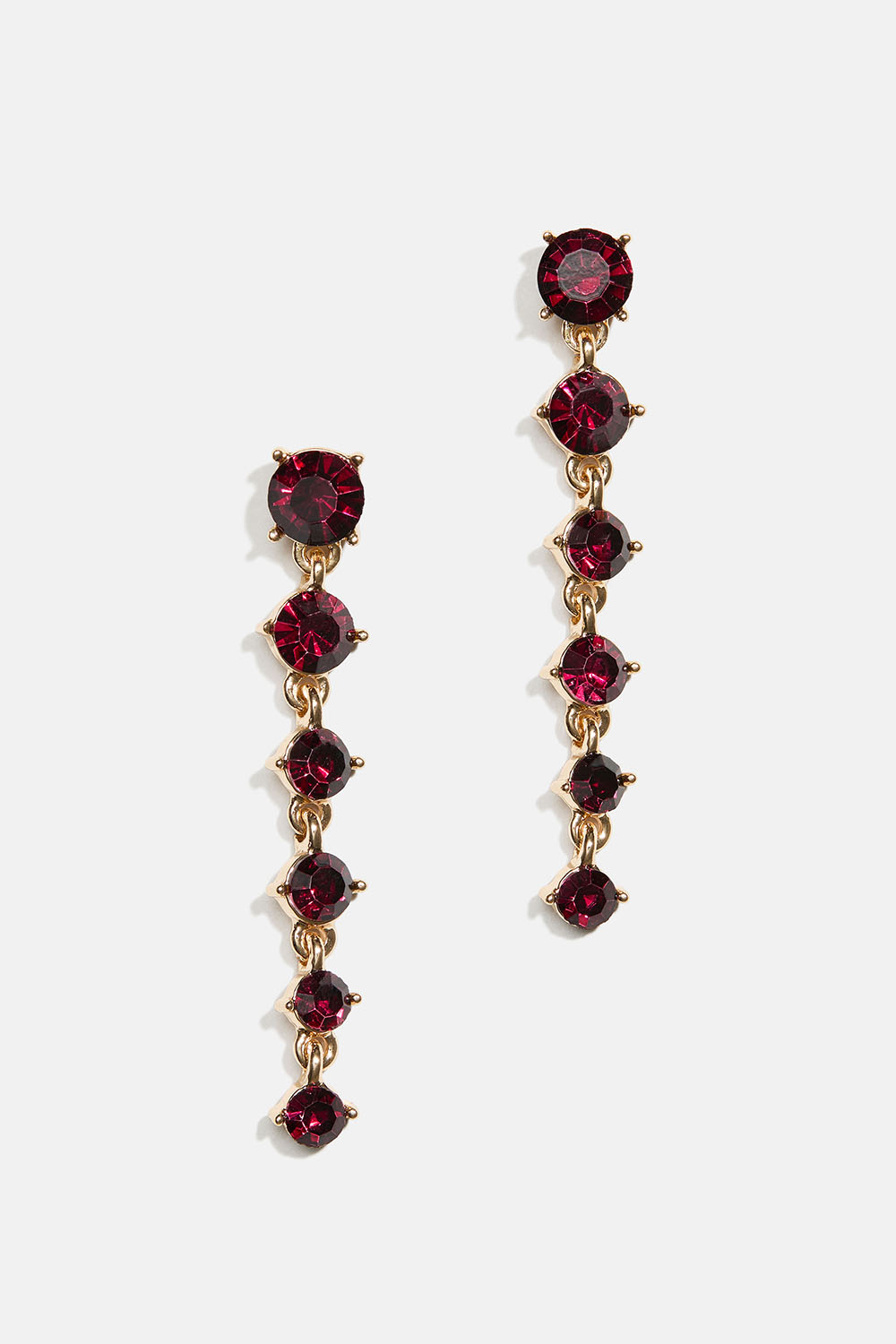 Kullanväriset metallikorvakorut, joissa on pyöreitä, viininpunaisia lasikiviä pienenevässä kokojärjestyksessä.