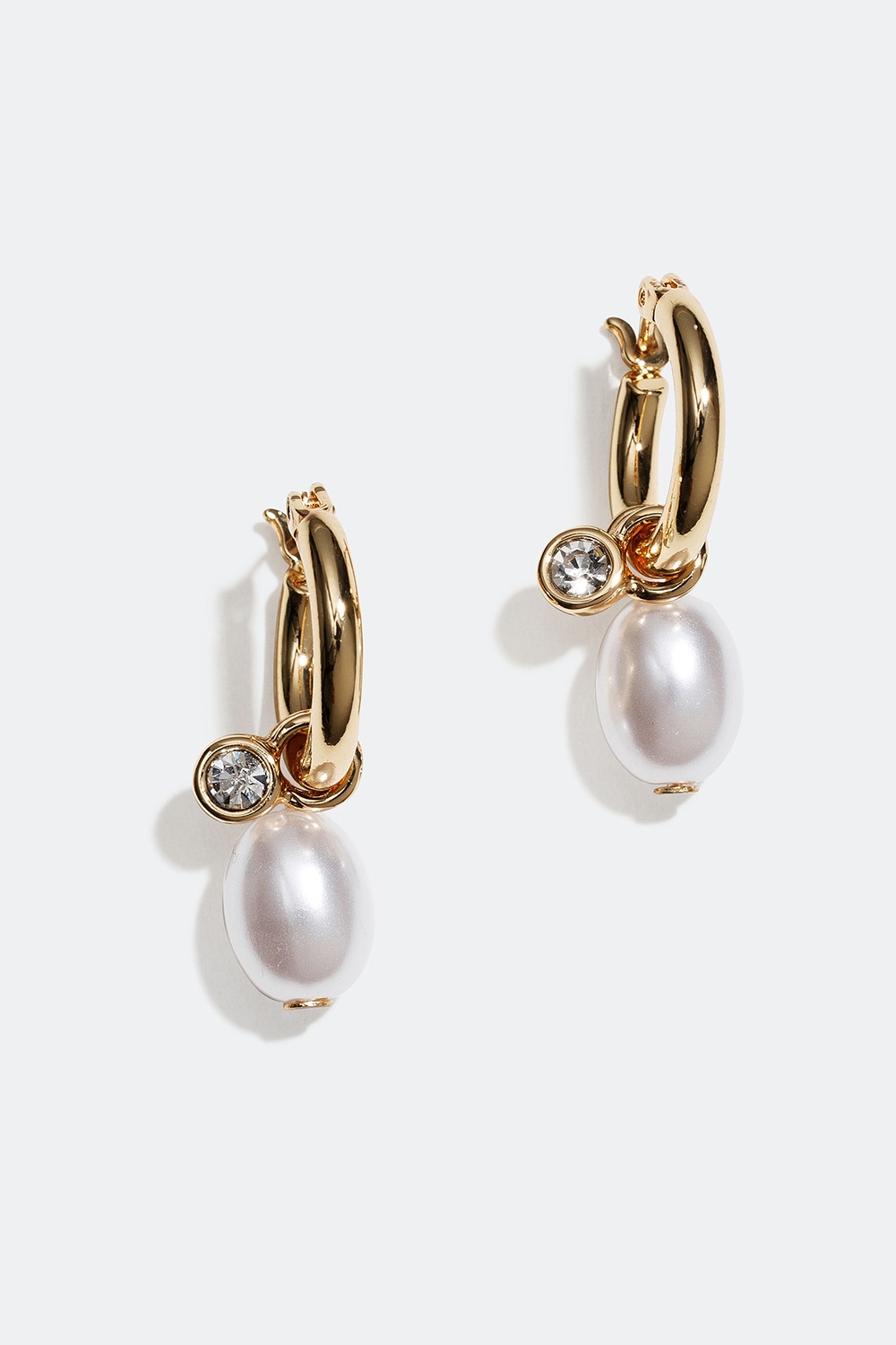 Pienet korvarenkaat, joissa riipuksina valkoinen helmi ja pieni pyöreä lasikivi. Koristeelliset korvarenkaat, joissa klassiset riipukset. Korvarenkaat sopivat sekä arkeen että juhlaan.