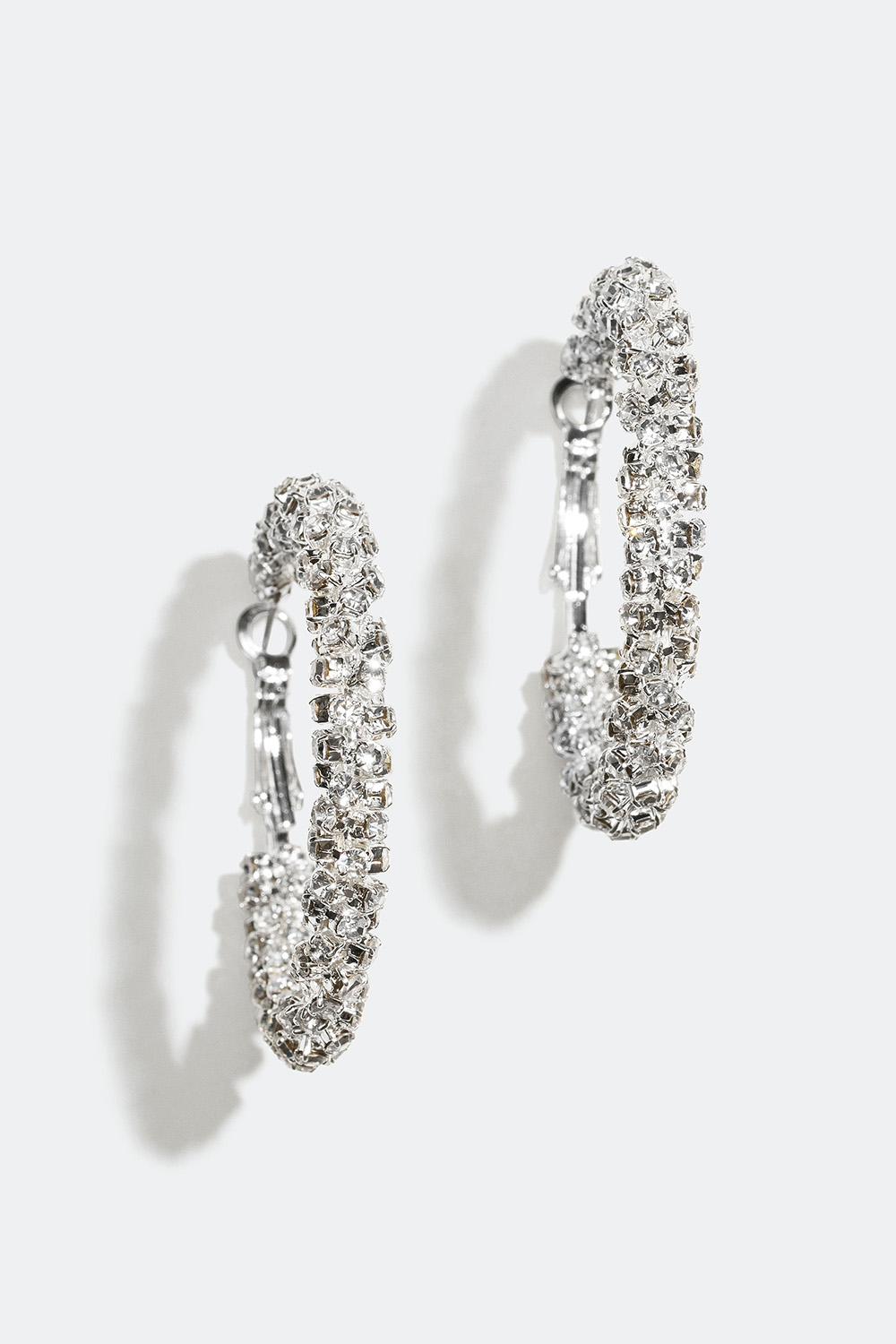 Hopeanväriset metalliset korvarenkaat, jotka on koristeltu hohtavilla lasikivillä kierretyssä muotoilussa. Kiiltävät strassikorvakorut, jotka sopivat täydellisesti juhliin ja muihin tapaamisiin.