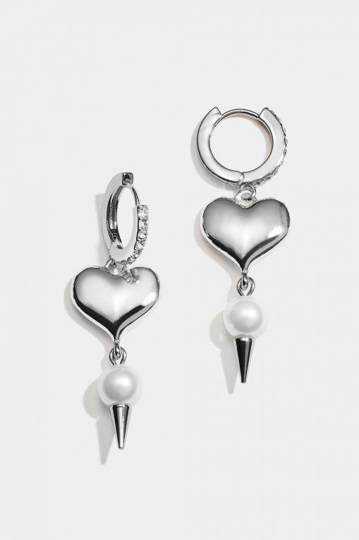 Strasseilla koristellut korvarenkaat, joissa roikkuu sydän, helmi ja niitti.