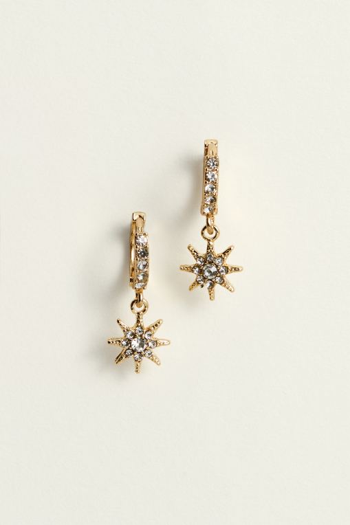 Metalliset korvarenkaat, joissa tähden muotoiset riipukset. Tähdissä ja korvarenkaan etuosassa on koristeena valkoisia lasikiviä. Kimaltelevat korvakorut, jotka sopivat kaikkiin tilanteisiin.