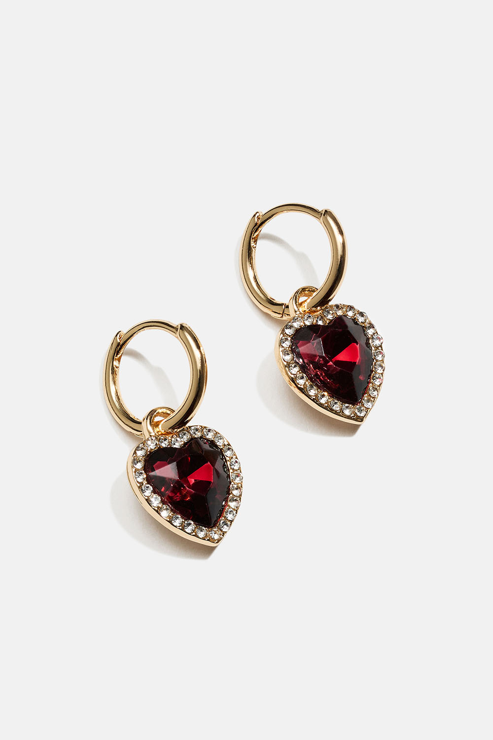 Kullanvärisestä metallista valmistetut korvarenkaat, joista roikkuu viininpunaiset, kirkkailla kivillä koristellut sydämenmuotoiset lasikivet.