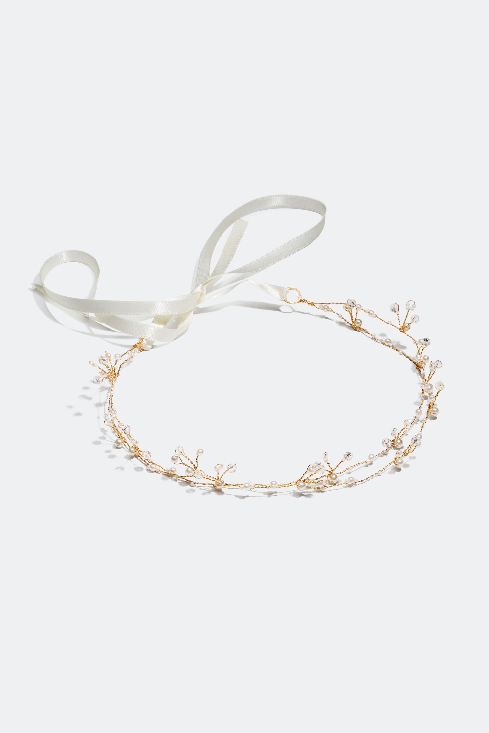 Kaunis, kierretty hiuskoriste. Kullanväriset metallilangat on koristeltu lasikivillä ja muovihelmillä ja solmittu hienosti yhteen valkoisella satiininauhalla.
