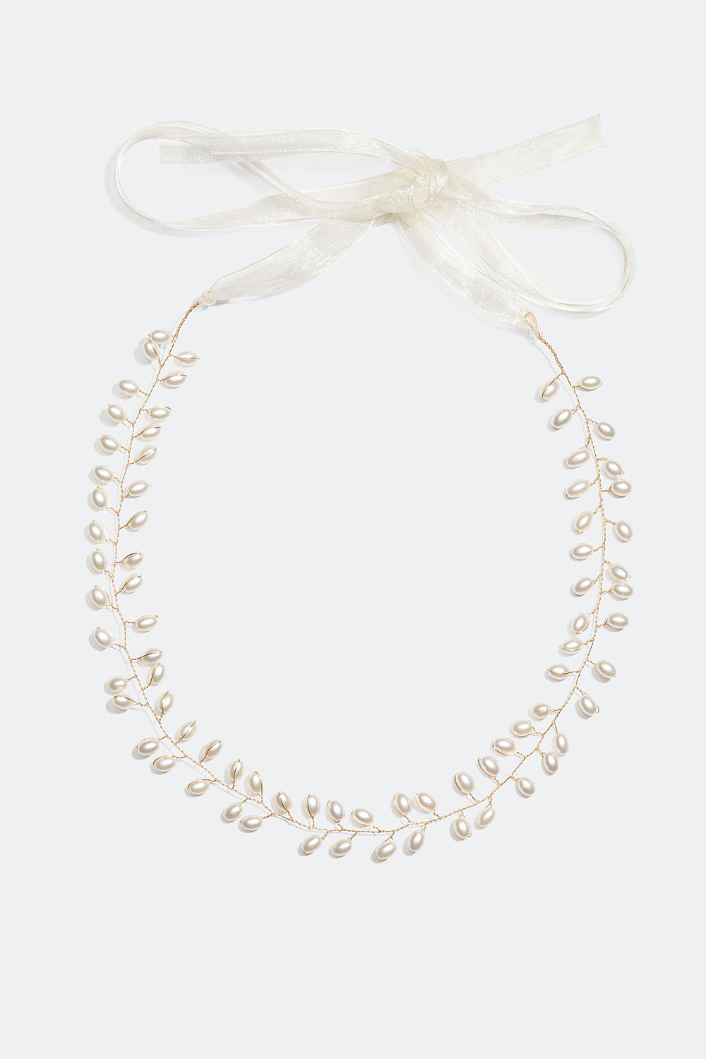 Kaunis hiuskoriste, jossa on punottua, kullanväristä metallilankaa ja koristeena valkoisia helmiä. Täydellinen hiusasuste juhliin ja häihin, joka sopii upeasti yhteen valkoisen hiuspannan kanssa.