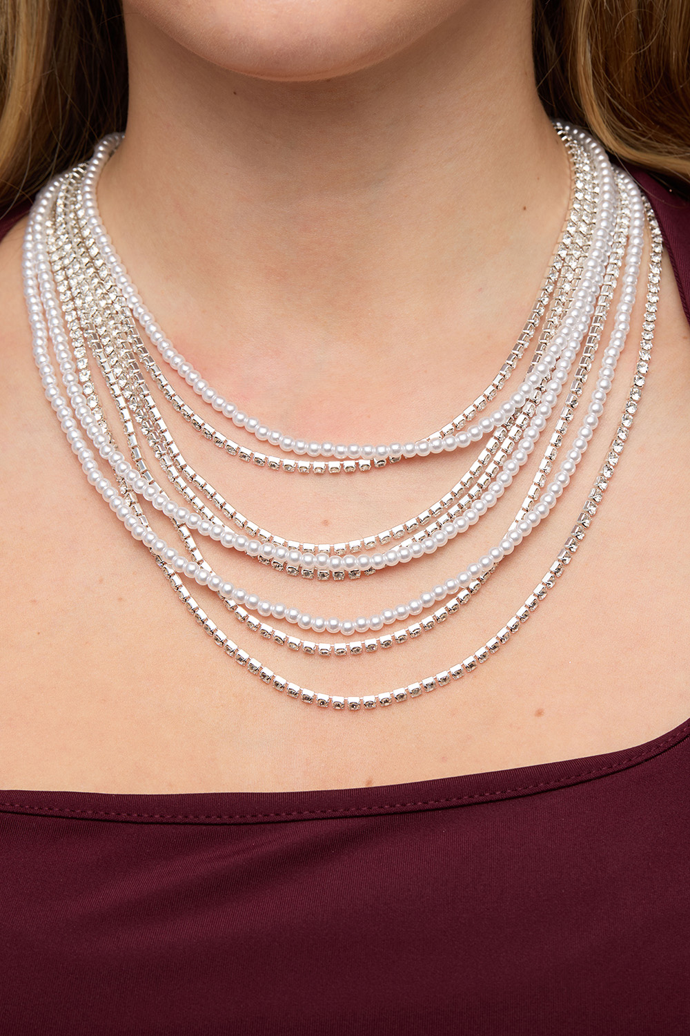 Kaulakoru, jossa on kahdeksan eripituista ketjua, joista viidessä on strasseja ja kolmessa valkoisia helmiä.