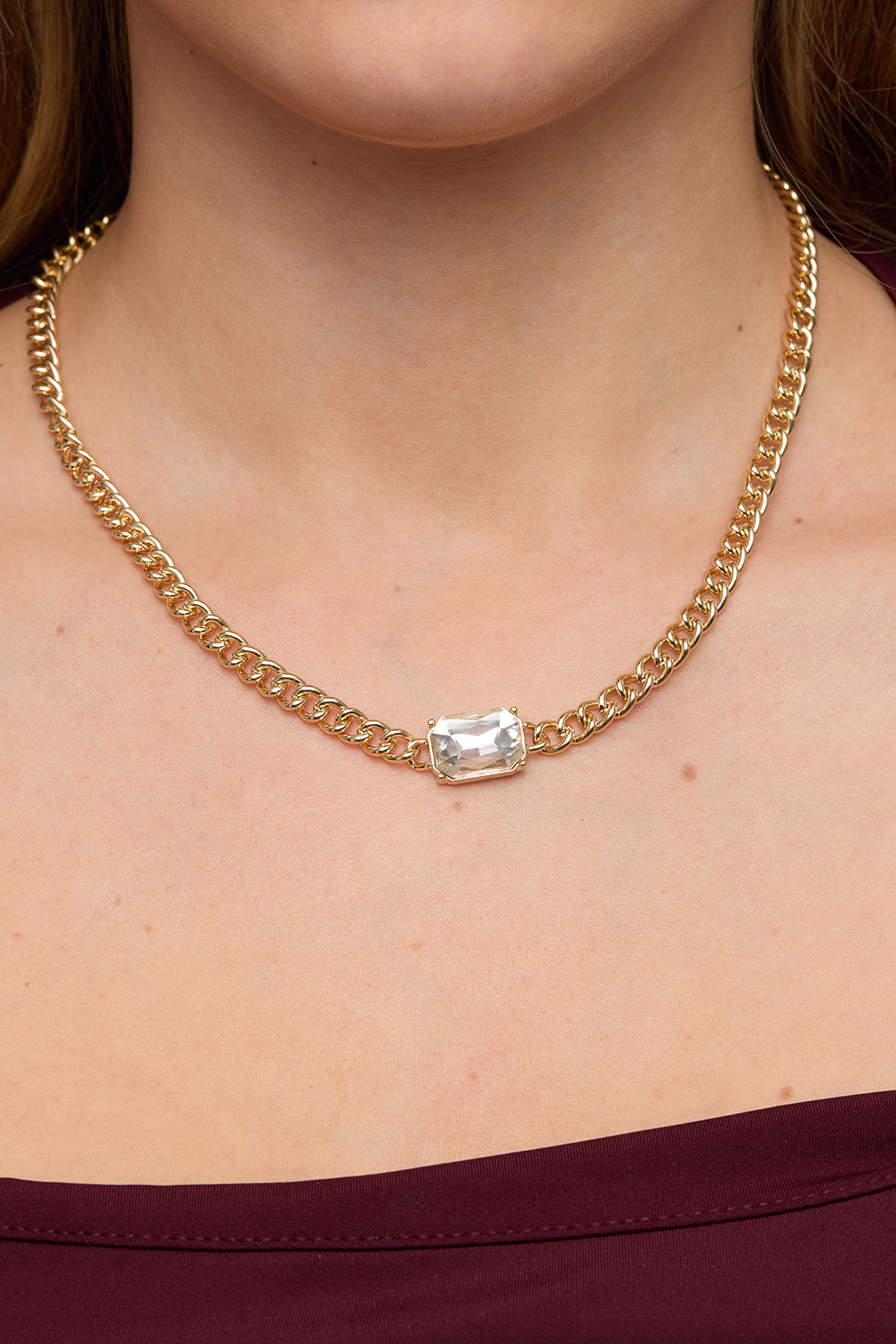 Kullanvärinen metallinen ketjukaulakoru, jossa on rouhea ketju ja suorakaiteen muotoinen iso lasikivi.