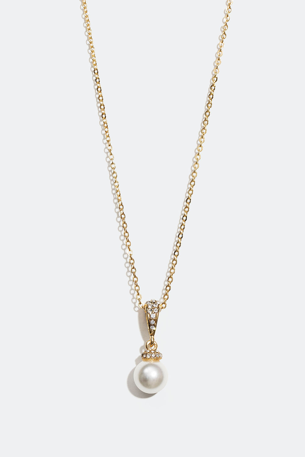 Kullanvärinen kaulakoru, josssa on ketju, lasihelmiriipus ja lasikiviä Tyylikäs kaulakoru, jossa on kimaltavia yksityiskohtia.