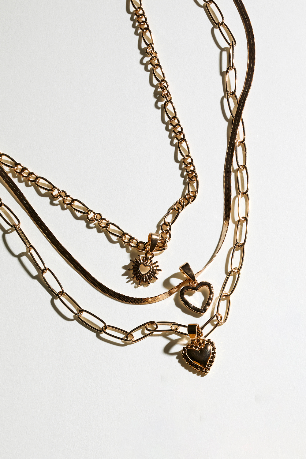 Kaulakoru, jossa on kolme erilaista ketjua, joissa on sydämen ja auringon muotoiset riipukset.