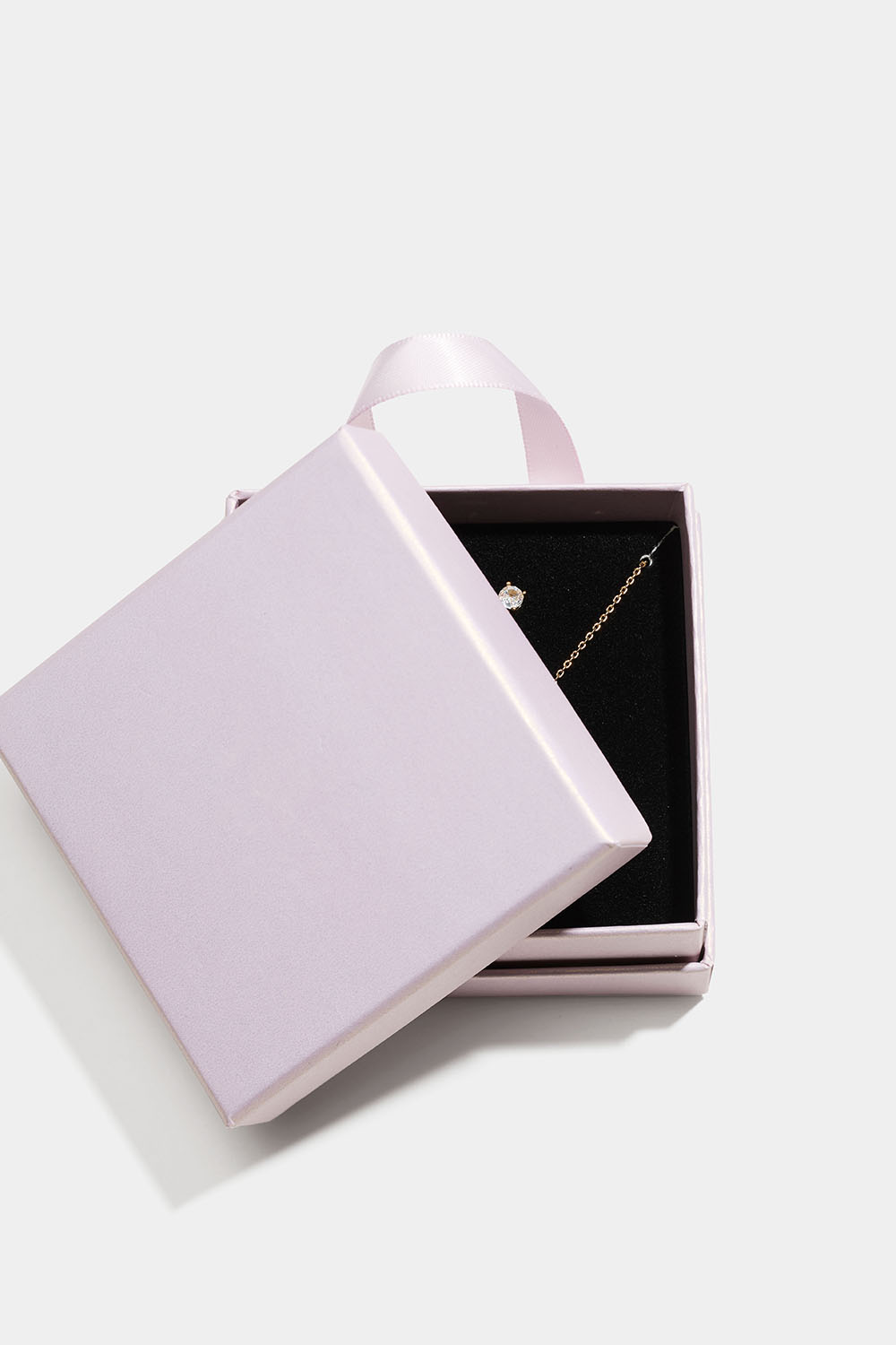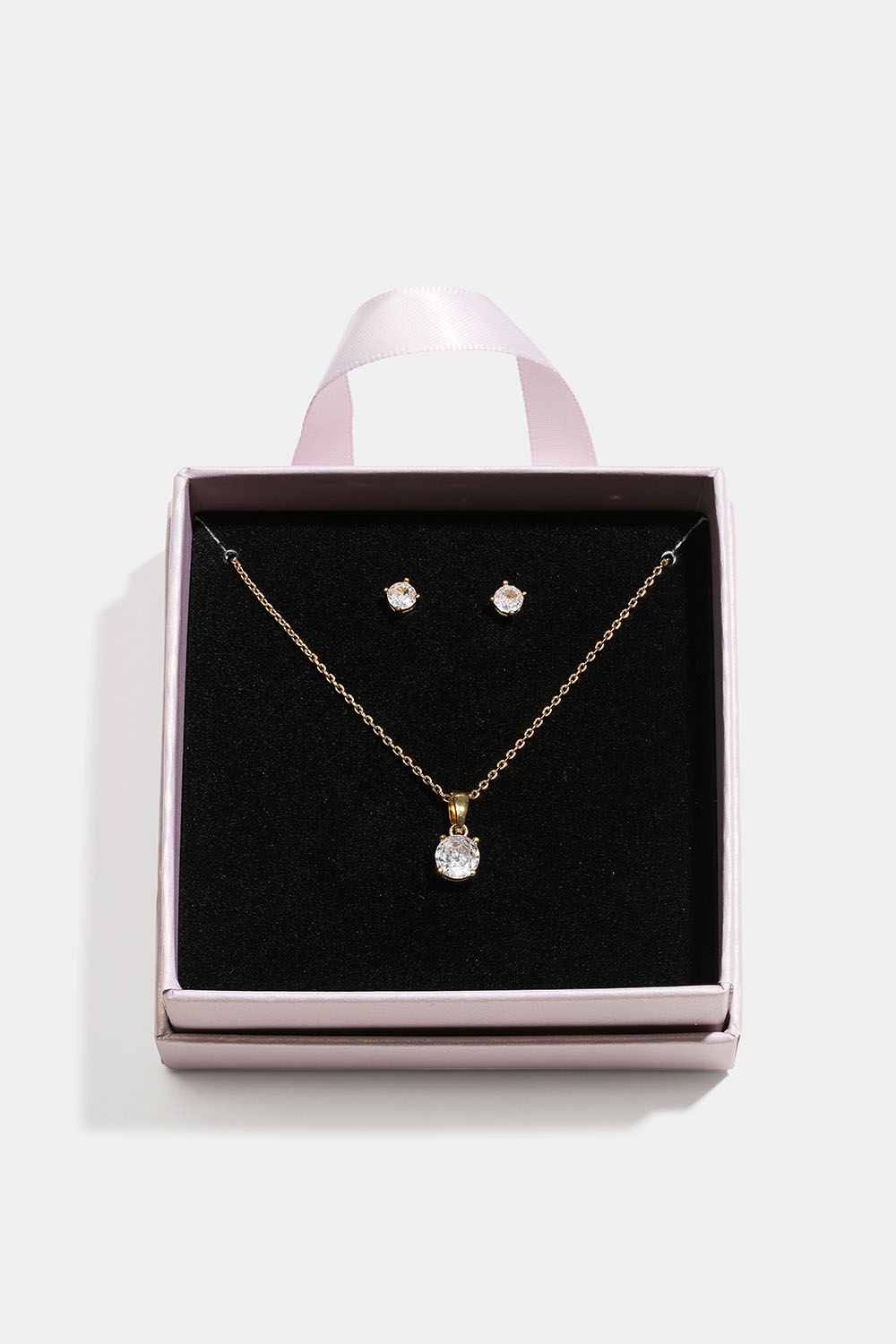 Korusarja koostuu parista kullanvärisiä nappikorvakoruja, joissa on valkoisia lasikiviä, ja kullanvärisestä kaulakorusta, jossa on valkoinen lasikivi, kauniisti pakattuna vaaleanpunaiseen lahjalaatikkoon, jossa on musta samettityyny.