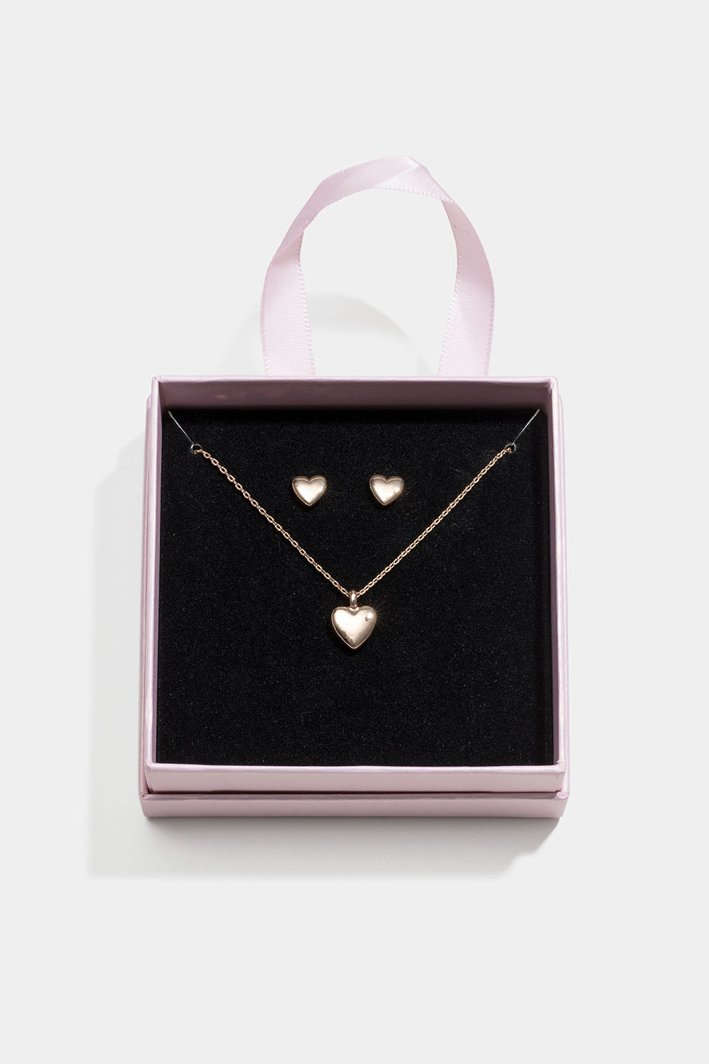 Korusarja koostuu parista kullanvärisiä nappikorvakoruja, joissa on sydämet, ja kullanvärisestä kaulakorusta, jossa on sydänriipus, kauniisti pakattuna vaaleanpunaiseen lahjalaatikkoon, jossa on musta samettityyny.