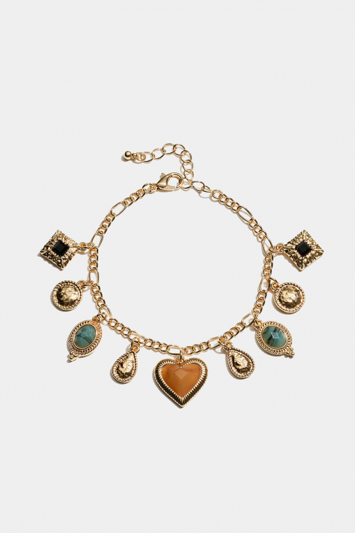 Kullanvärinen rannekoru, jossa erilaisia riipuksia
