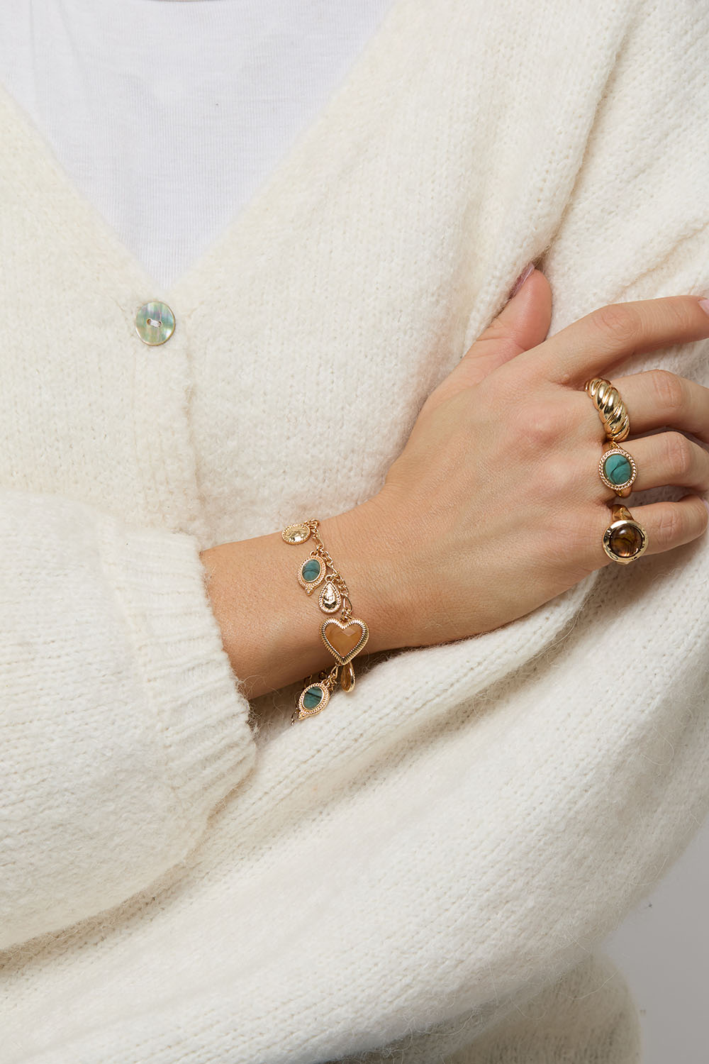 Kullanvärinen metallirannekoru, jossa on useita eri värisiä ja muotoisia riipuksia, kuten sydän, pyöreä, pisara ja neliö.
