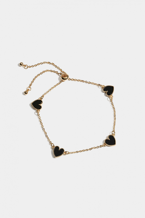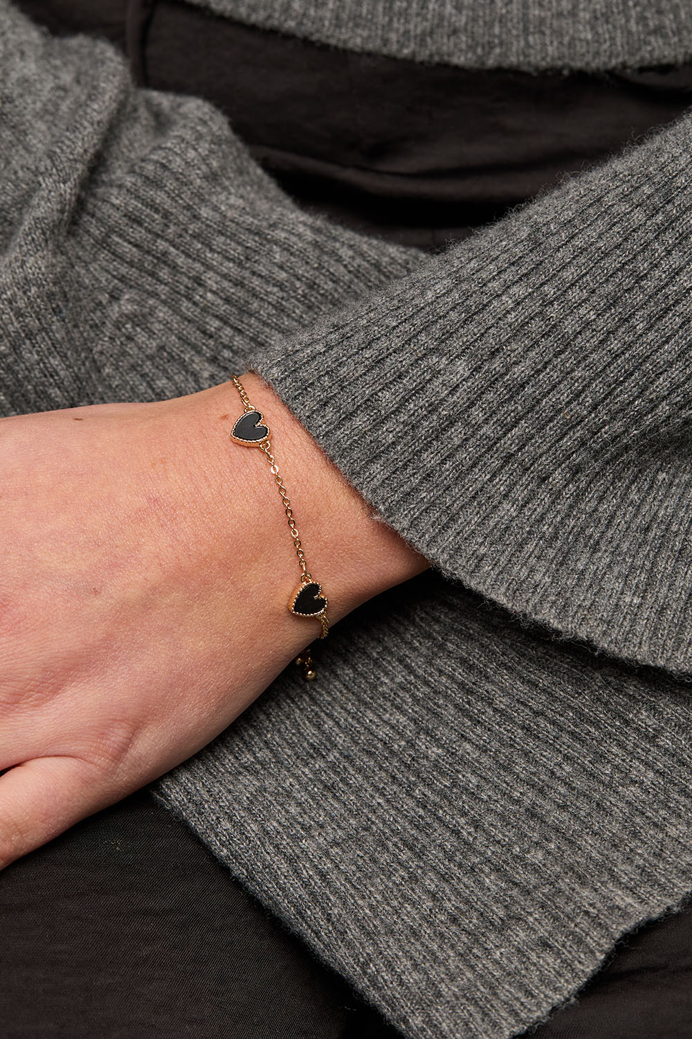 Ohut ranneketju, joka on koristettu kimaltavilla mustilla sydämillä. Ketjun pituus on säädettävissä kumilla päällystetyn kultahelmen avulla.