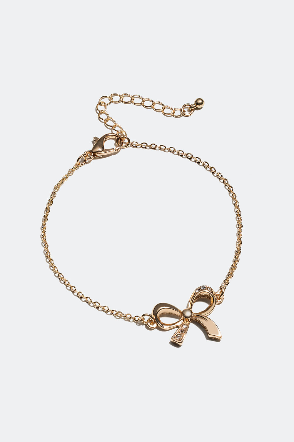 Kullanvärinen metallirannekoru, jossa on elegantisti lasikivin koristeltu rusetti. Tyylikäs rannekoru, jossa on kimaltava yksityiskohta.